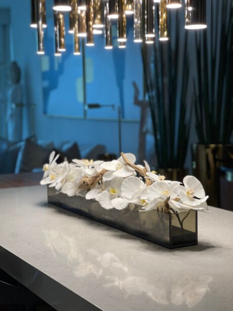 36″ Casa Moderna Black Tinted Glass Plate Planter with white Phalaenopsis orchids