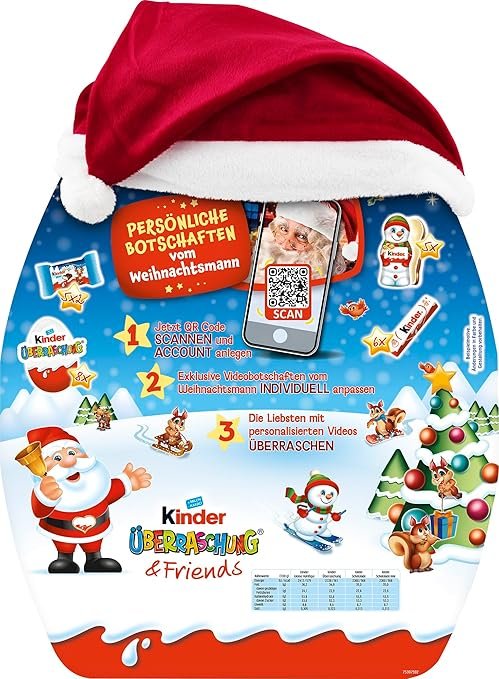 What is hidden behind the next door? The advent calendar from kinder Surprise & Friends provides an exciting Advent season with 24 surprises in a unique Ü-Egg design. Day after day 1 of 4 different treats from the children’s range. The delicious mix of colourful products and 8 surprise eggs gives a cheerful pre-Christmas season. The Christmas hat for putting on provides even more Advent fun